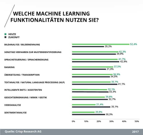 Machine Learning kann dazu verwendet werden Vorhersagemodelle zu entwickeln oder Entscheidungen auf Grundlage von Entscheidungsbaummodellen zu treffen. In Kundensupportsystemen kann Machine Learning besonders für den Einsatz von Chatbots genutzt werden. Diese Chatbots können die Fragen eines Kunden auf der Grundlage von Trainings- und Echtzeitdaten, welche die Entscheidungsbaumstrukturen des Bots weiter verbessern, bereits in vielen Fällen passend beantworten. Im Januar 2017 führte Crisp Research eine Studie zu den zukünftigen Einsatzgebieten von Machine Learning durch, welche dessen Bedeutung nochmals untermauert. Dort gaben jeweils über 40 % der befragten Unternehmen an, dass die Funktionalität von Machine Learning in den Bereichen der Sprachsteuerung sowie Spracherkennung und der Textanalyse sowie im Natural Language Processing zukünftig verstärkt genutzt wird.