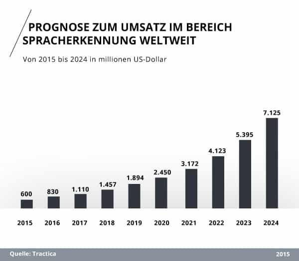 Fast fünfzig Jahre später ist die Technologie der Sprach- und Texterkennungssysteme bereits sehr ausgereift und wird stetig weiterentwickelt. Das KI-Beratungsunternehmen Tractica prognostiziert dem Bereich der Spracherkennung ein sehr hohes Umsatzpotential. So soll der Umsatz im Bereich der Spracherkennung innerhalb von zehn Jahren von 600 Millionen US-Dollar (2015) auf 7.125 Millionen US-Dollar (2024) ansteigen.