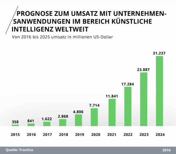 Laut einer Prognose von Tractica, wird sich der Umsatz von Unternehmensanwendungen im Bereich der künstlichen Intelligenz weltweit im Jahr 2025 auf über 30 Milliarden US-Dollar belaufen.