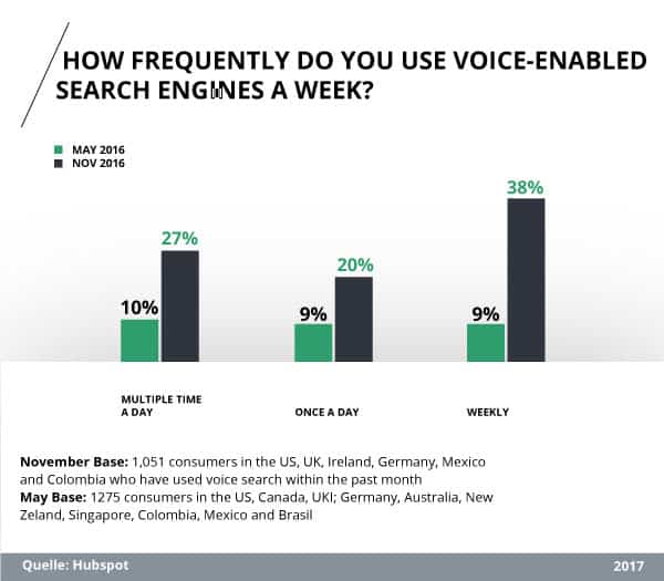 Das rasante Wachstum bestätigt ebenso eine Studie von HubSpot, welche die Häufigkeit des Gebrauchs von sprachbasierten Suchanfragen in den gängigen Suchmaschinen im Mai und November 2016 untersuchte. Dabei konnte ermittelt werden, dass die wöchentliche Nutzung der Befragten innerhalb von sechs Monaten von 9% auf 38% anstieg.