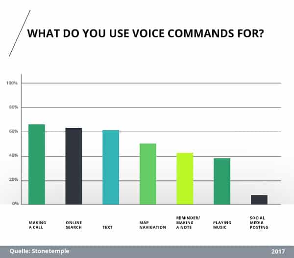 Die Gründe für die Nutzung werden umso deutlicher, wenn die Anwendungsbereiche von Voice Search betrachtet werden. So nutzen jeweils über 60% der Befragten die Suche per Sprache zum Starten von Kontaktanrufen, dem Suchen in Suchmaschinen und dem Verfassen von Texten. Ebenso die Nutzung der Navigationssoftware, die Steuerung der Musikanlage sowie das Anlegen von Erinnerungen oder Kalendereinträgen werden als Gründe aufgeführt.