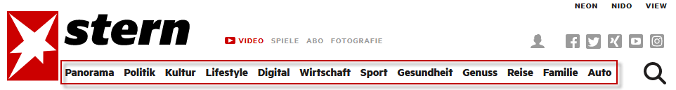 Jeder Menüpunkt der Hauptnavigation führt dabei idealtypisch zu einem (Haupt-)Bereich, der sich inhaltlich von den anderen Bereichen der Website unterscheidet. Nachfolgend ist zur besseren Veranschaulichung die Hauptnavigation von stern.de illustriert.